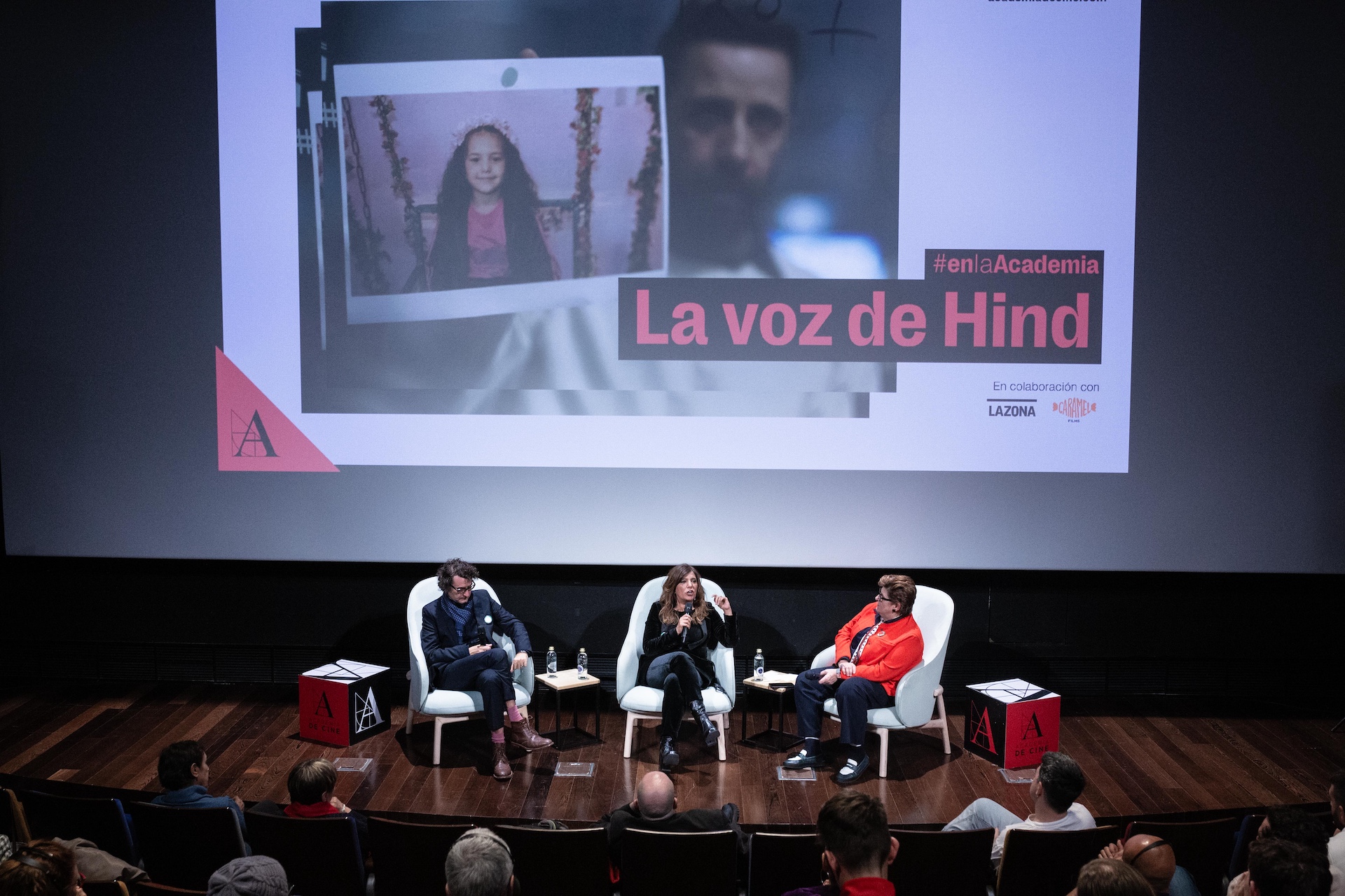 Este jueves la Academia de Cine acogió un encuentro con la directora y guionista Kaouther Ben Hania y el productor Nadim Cheikhrouha tras el preestreno de La voz de Hind, largometraje que usa llamadas reales al servicio de emergencias palestino.