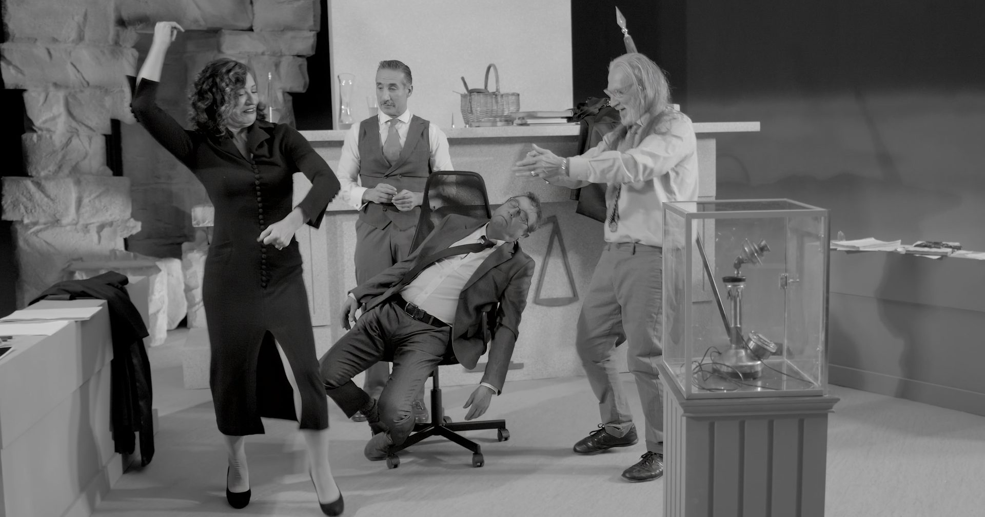 Se inicia el juicio en el que la acusada acepta la culpa de “decir la verdad”, y, para poseer y ser poseída, solicita a través de su abogado “realizar coito con su señoría”, se acepta la solicitud y continua el juicio. Suena un teléfono y se ordena que la acusada pase a ser la abogada del abogado, ahora acusado de haber matado a su esposa por amor, se siente arrepentido y es condenado; pero vuelve a sonar el teléfono y la sentencia se suspende ordenando que el juez pase a ser el acusado y la abogada asuma el puesto de jueza. Mediante cambios inesperados el juicio desemboca en una sentencia que condena al propio juez del Tribunal Supremo: al encargado de mantener la Ley en que se fundamenta esta sociedad se le reconoce el mérito de ser corrupto, pero comete el delito de “sentirse humano”.