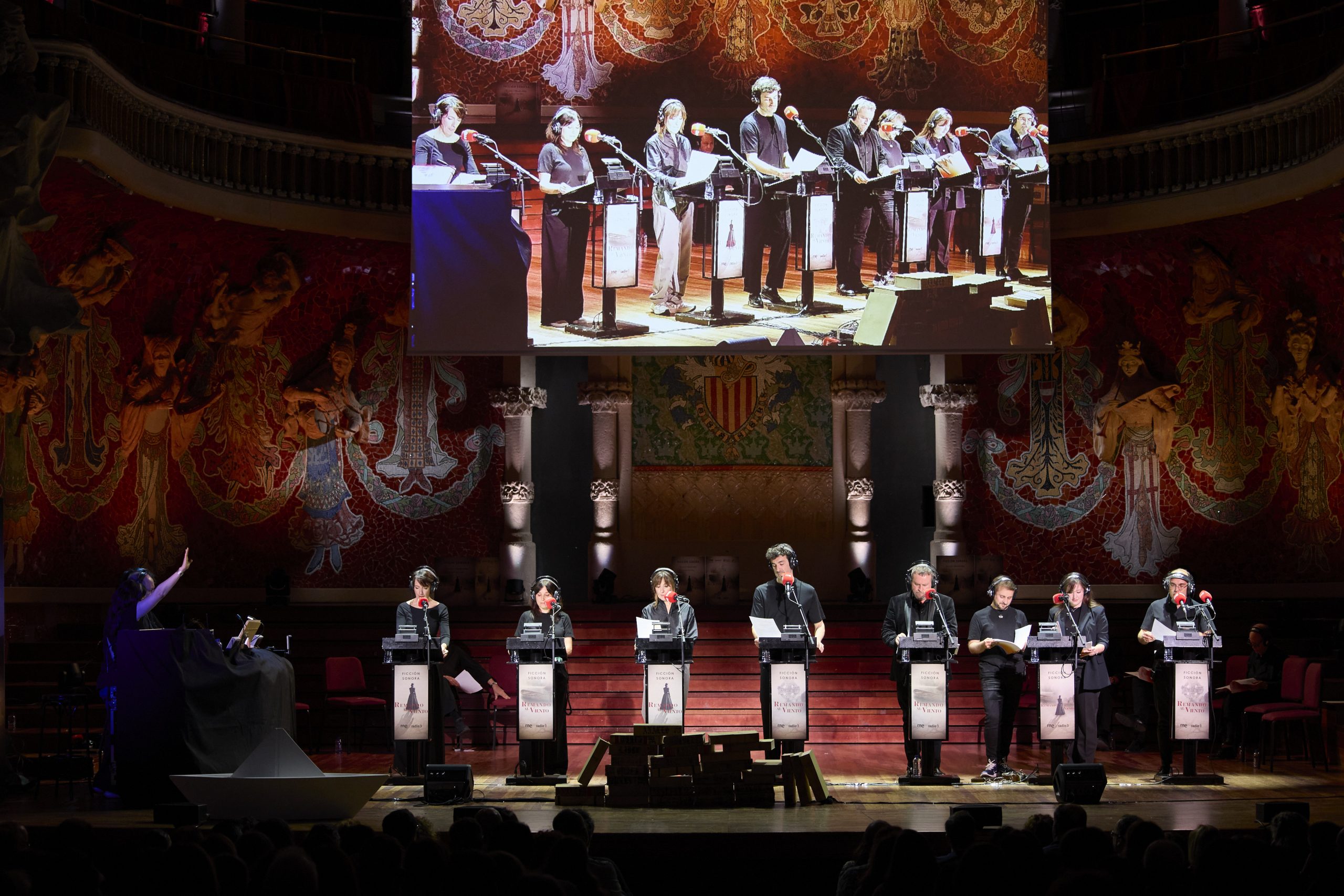 El Palau de la Música de Barcelona acogió este jueves el estreno de la Ficción Sonora Remando al viento, una iniciativa de la Academia de Cine y RNE para rendir homenaje al Goya de Honor de la 40 edición de los Premios Goya, Gonzalo Suárez. De este modo, la institución y el ente público han devuelto a escena el universo romántico creado por el cineasta. Un universo convertido en experiencia sonora en directo, emitida simultáneamente por Radio 3 y RTVE Play.
