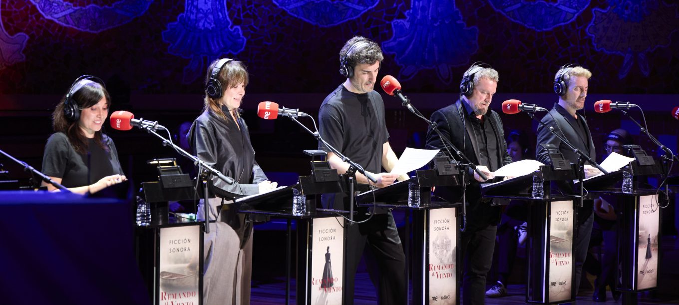 El Palau de la Música de Barcelona acogió este jueves el estreno de la Ficción Sonora Remando al viento, una iniciativa de la Academia de Cine y RNE para rendir homenaje al Goya de Honor de la 40 edición de los Premios Goya, Gonzalo Suárez. De este modo, la institución y el ente público han devuelto a escena el universo romántico creado por el cineasta. Un universo convertido en experiencia sonora en directo, emitida simultáneamente por Radio 3 y RTVE Play.